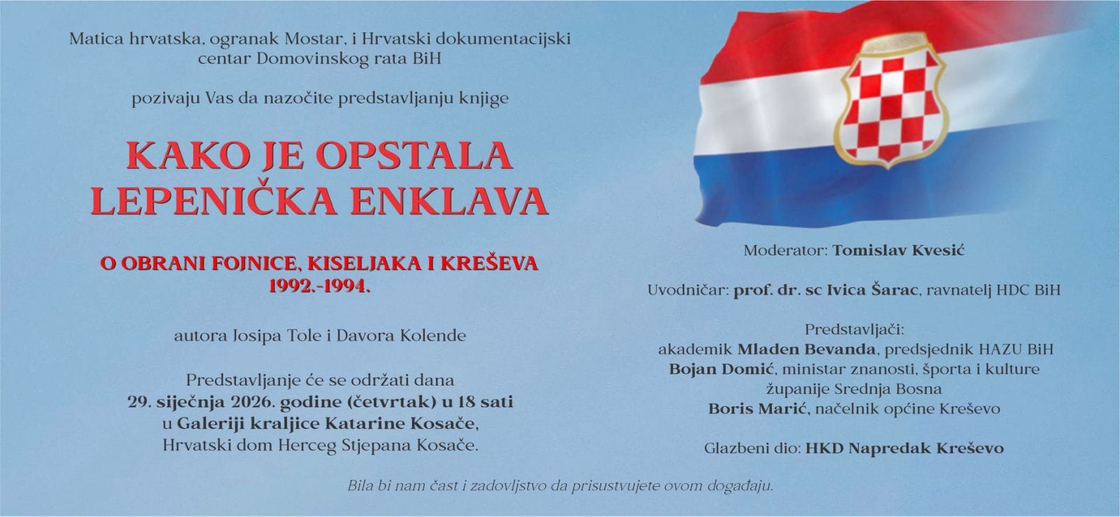 Značaj ove knjige je u tome što daje odgovore na mnoge situacije iz ratnog razdoblja koje nisu dovoljno jasno rasvijetljene te da će biti od pomoći napose mladim ljudima s područja ratne enklave, da steknu jasniju i bolju sliku o tom teškom razdoblju i borbi za opstanak hrvatskog naroda. Knjiga o opstanku Lepeničke enklave dokumentiranim činjenicama opisuje hrabru i odvažnu borbu hrvatskih branitelja. Ova knjiga je svojevrstan dug, ali i spomen na više od 400 poginulih branitelja Lepeničke enklave te temelj i opomena novim generacijama koje trebaju i moraju znati što je i kako bilo. Nakon Kreševa, Kiseljaka, Fojnice, Viteza i Zagreba knjiga “Kako je opstala Lepenička enklava”, autora Josipa Tole i Davora Kolende, bit će predstavljanja u Mostaru 29. siječnja 2026. godine (četvrtak) u 18 sati u Galeriji kraljice Katarine Kosače.